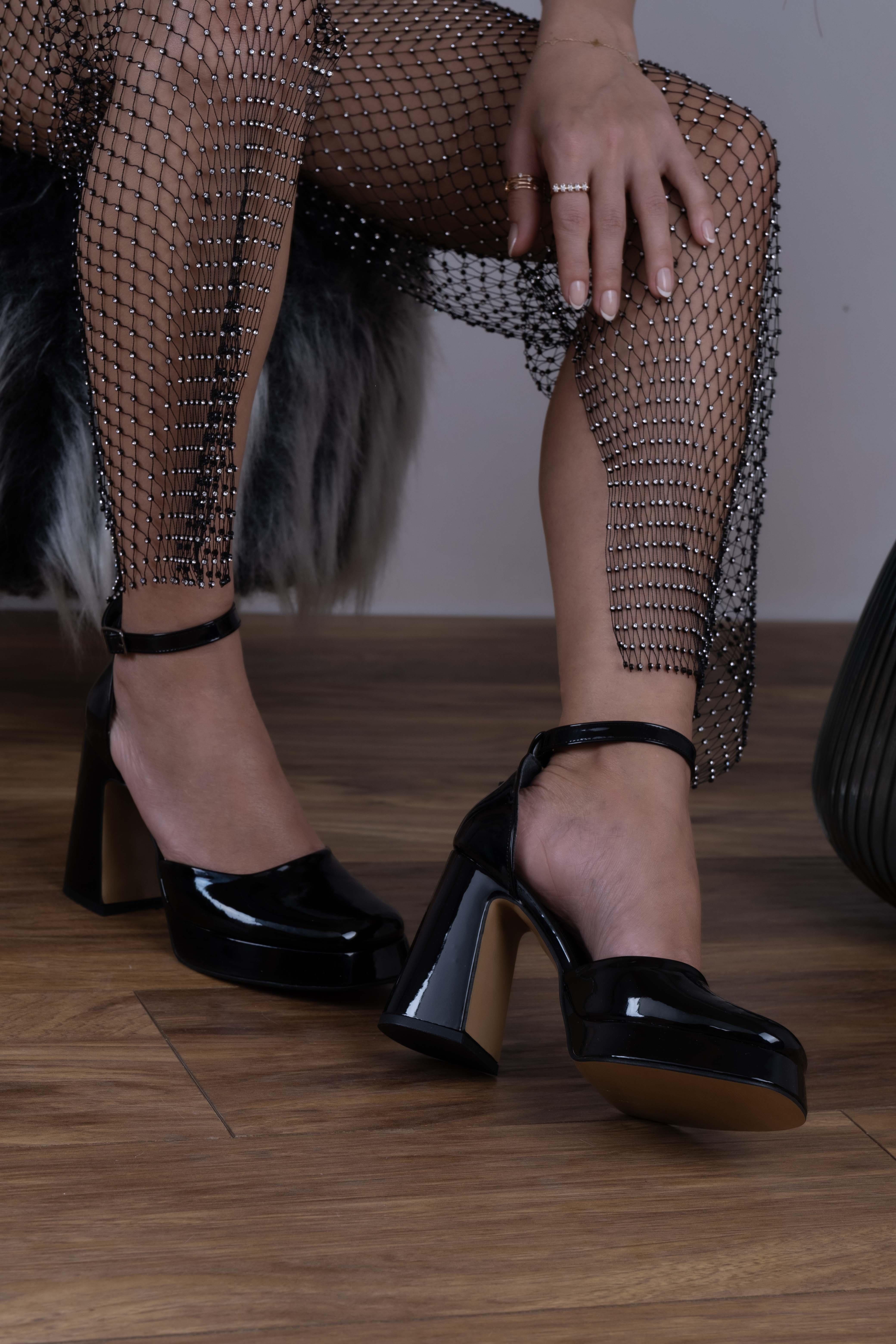 Rella Model Önü Kapalı Karnı Yarık Platform Topuklu Ayakkabı Siyah Rugan